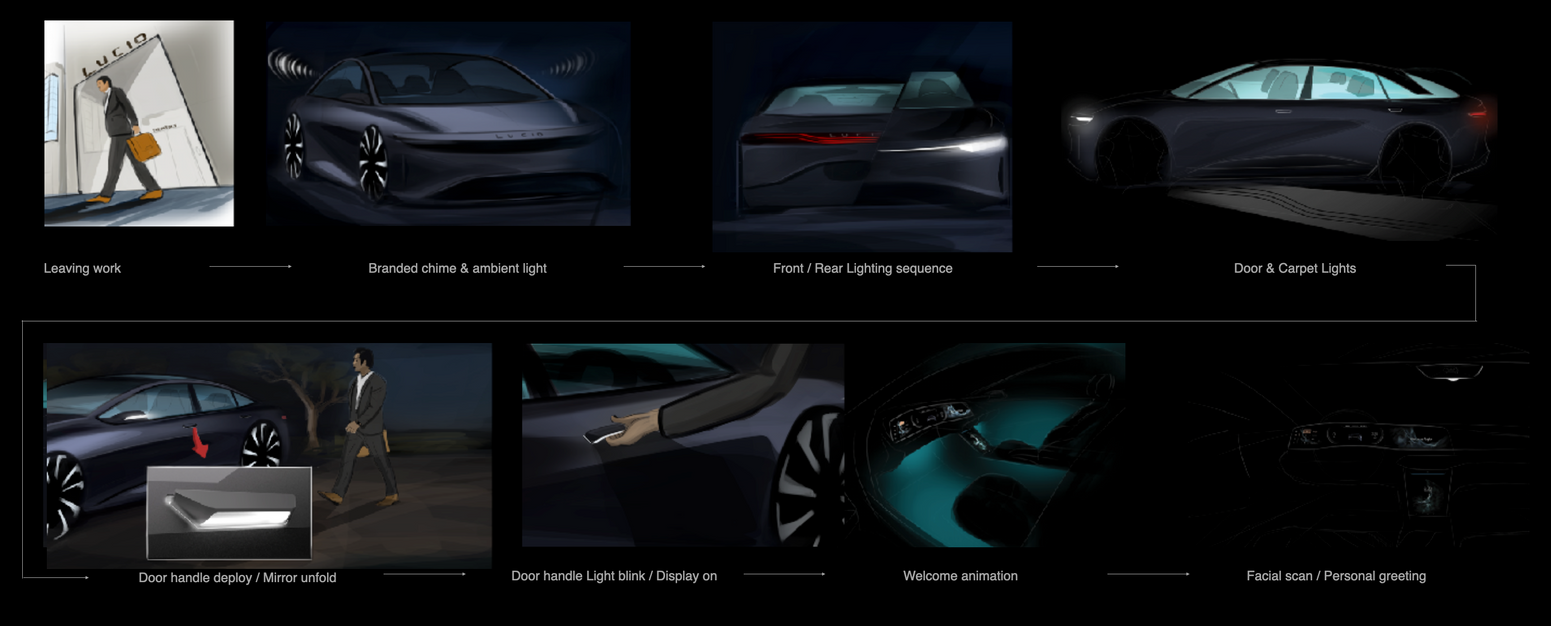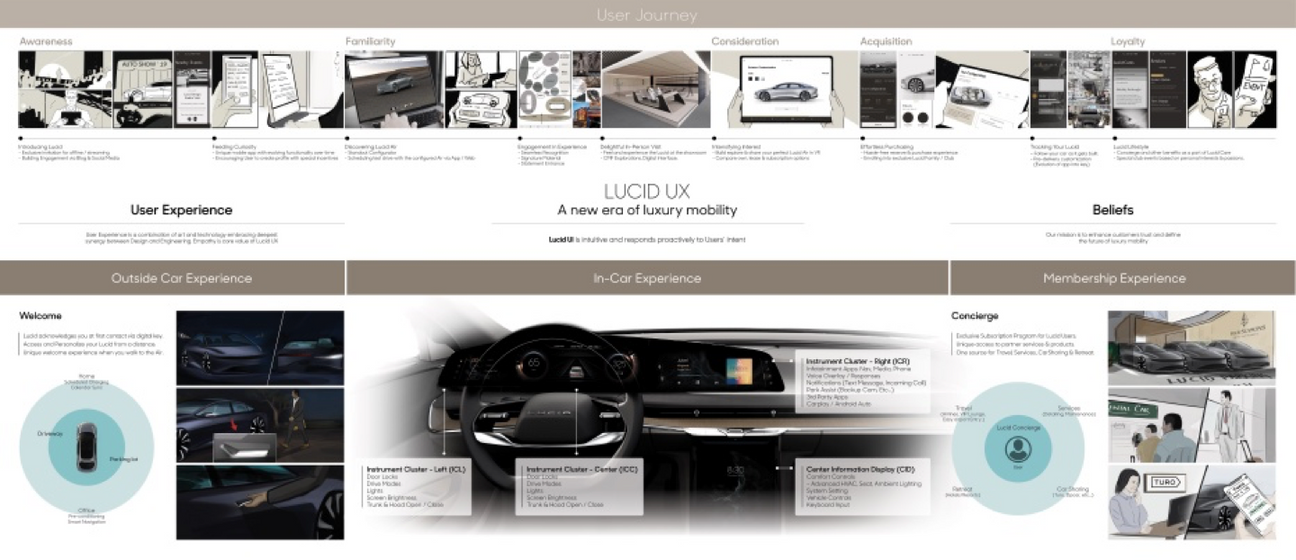 This customer journey overview illustrates the comprehensive journey customers embark on when introduced to the Lucid Air, designed to maintain engagement throughout the production process, beginning with the pre-order phase. The main focus of this journey is to highlight three key categories: Welcome Experience, Driver Experience, and Owners' Loyalty Program. Our objective was to establish the Lucid Air not merely as a car, but as a premium product complemented by exceptional service. The discipline of UX in this context encompasses the entire customer experience, extending beyond just the in-car system to ensure a seamless and enjoyable interaction at every touchpoint.